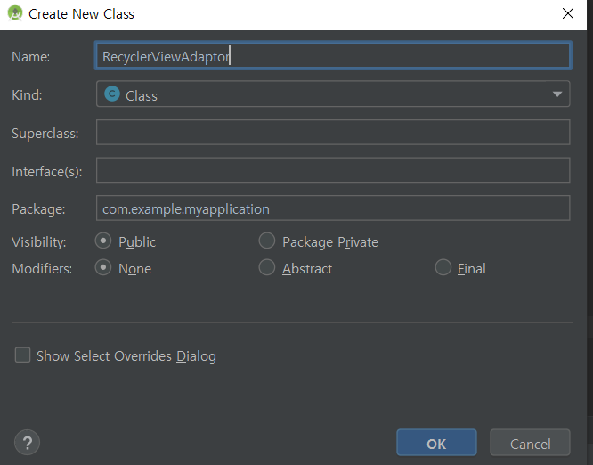 RecyclerViewAdaptor는 RecyclerView.Adaptor<>를 상속받는다. 그러면 override해야하는 method들이 3개가 존재하기 때문에 빨간줄로 그어질 것이다. 그럴 땐 빨간줄에 커서를 가져다대고 alt + enter를 눌러서 override해야하는 method들을 모두 가져오면 빨간줄이 사라진다.
