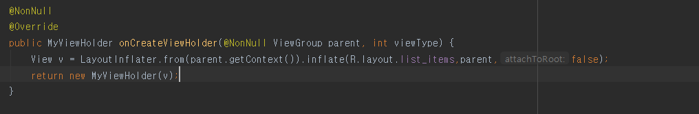 이를 위해서 아까 override한 함수들 중 onCreateViewHolder method를 이용하게 된다. 간단하게 설명하자면 container의 각 요소들은 view 객체가 들어가기 때문에 list_items xml 파일을 View로 객체화시켜야한다. 따라서 xml파일을 view로 객체화 시키기 위해 LayoutInflater를 사용하게된다.
